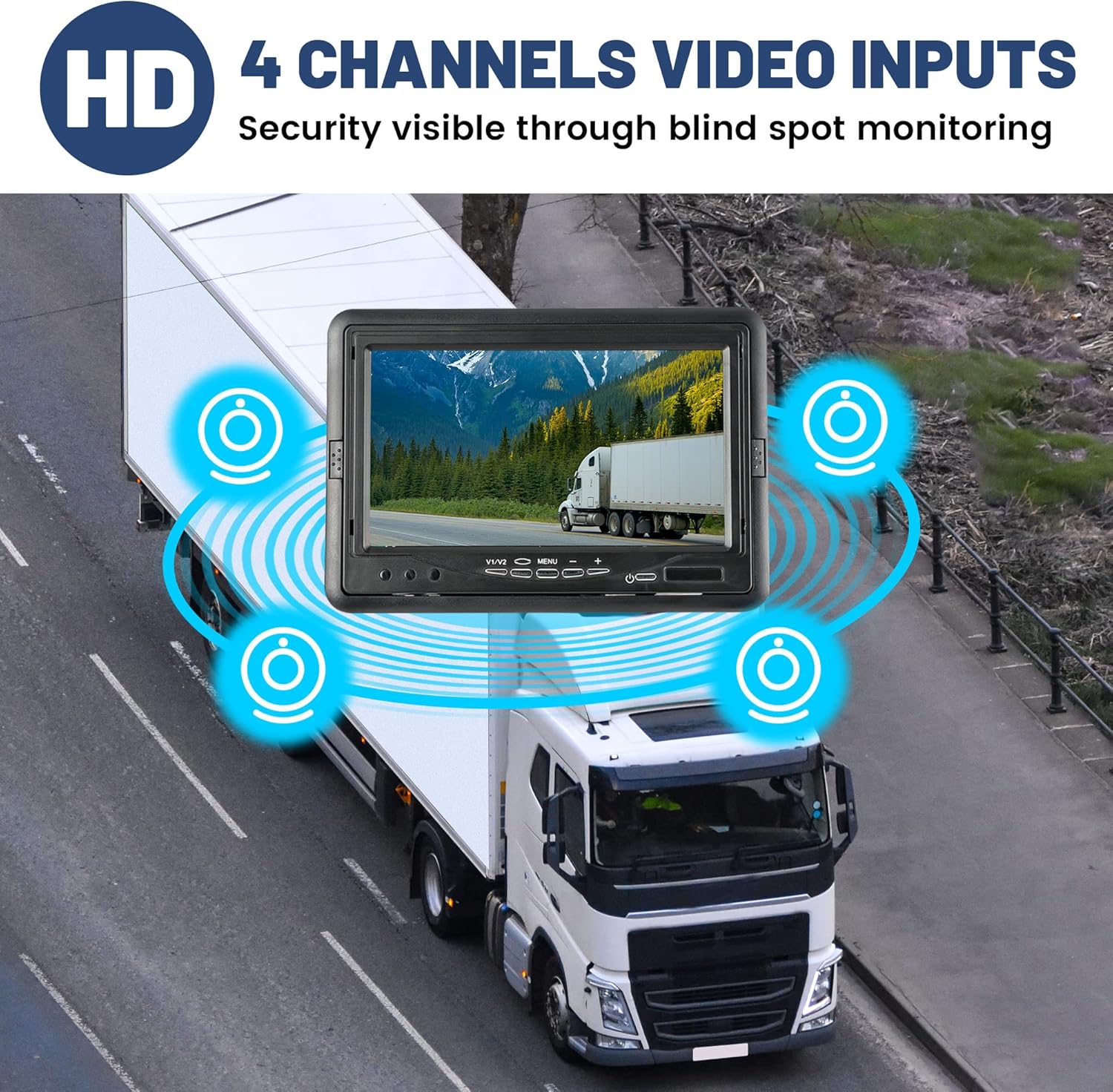 - 7 Inch TFT LCD displays support four video camera inputs, turn trigger wire to trigger each channel(V1, V2, V3,V4).