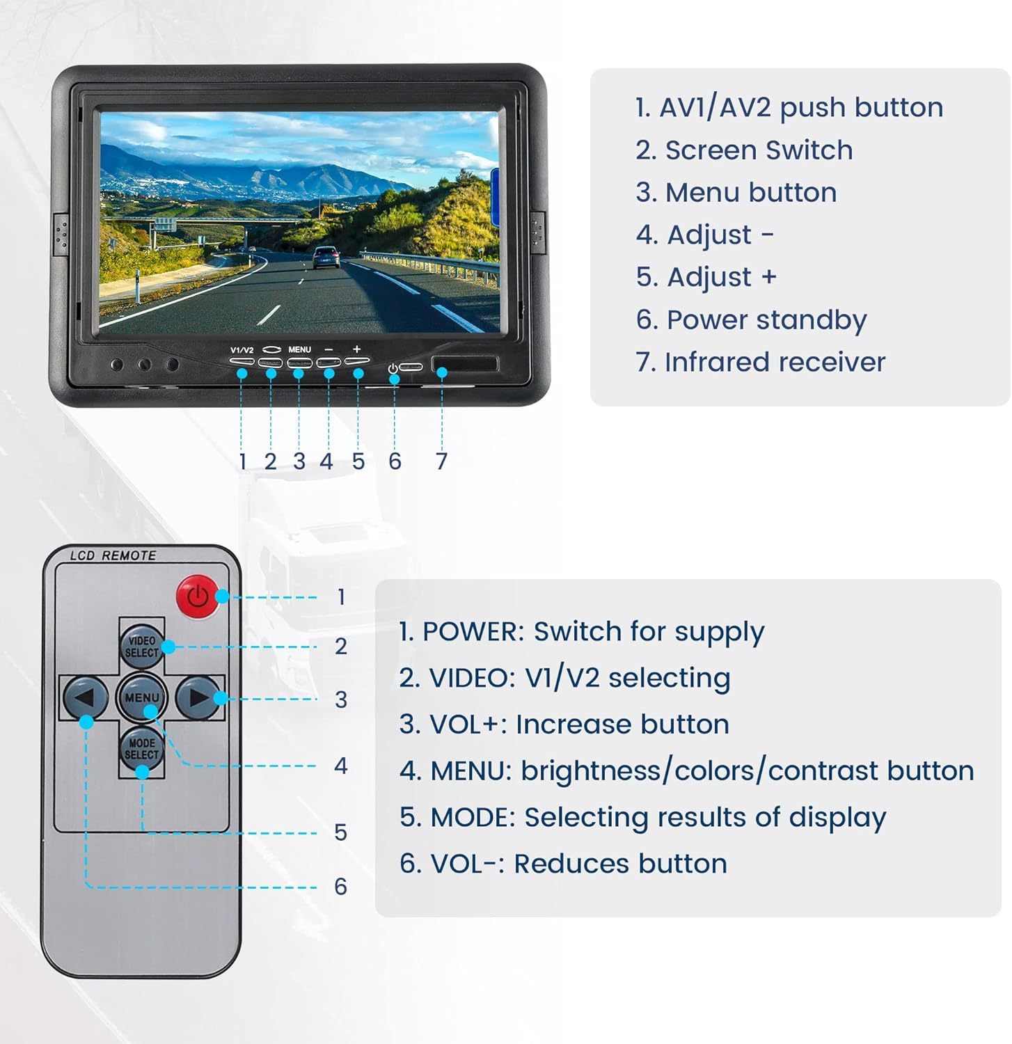 - 7" monitor comes with an IR remote controller for easy operation. Sunshade design for Anti-glare.
