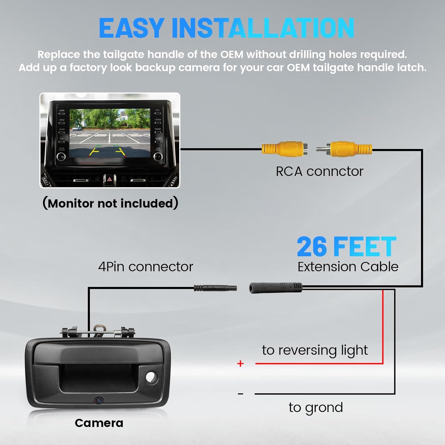 - 【RCA Video Connector】RCA yellow video plug for used with most aftermarket monitor video receiver with NTSC video input. Supporting connection with your radio, DVD player, navigation or any display with RCA video input. 26 Feet extension cable reverse camera offers you plenty length to reach from Silverado pickup tailgate rear door handle to your head unit or any aftermarket device.