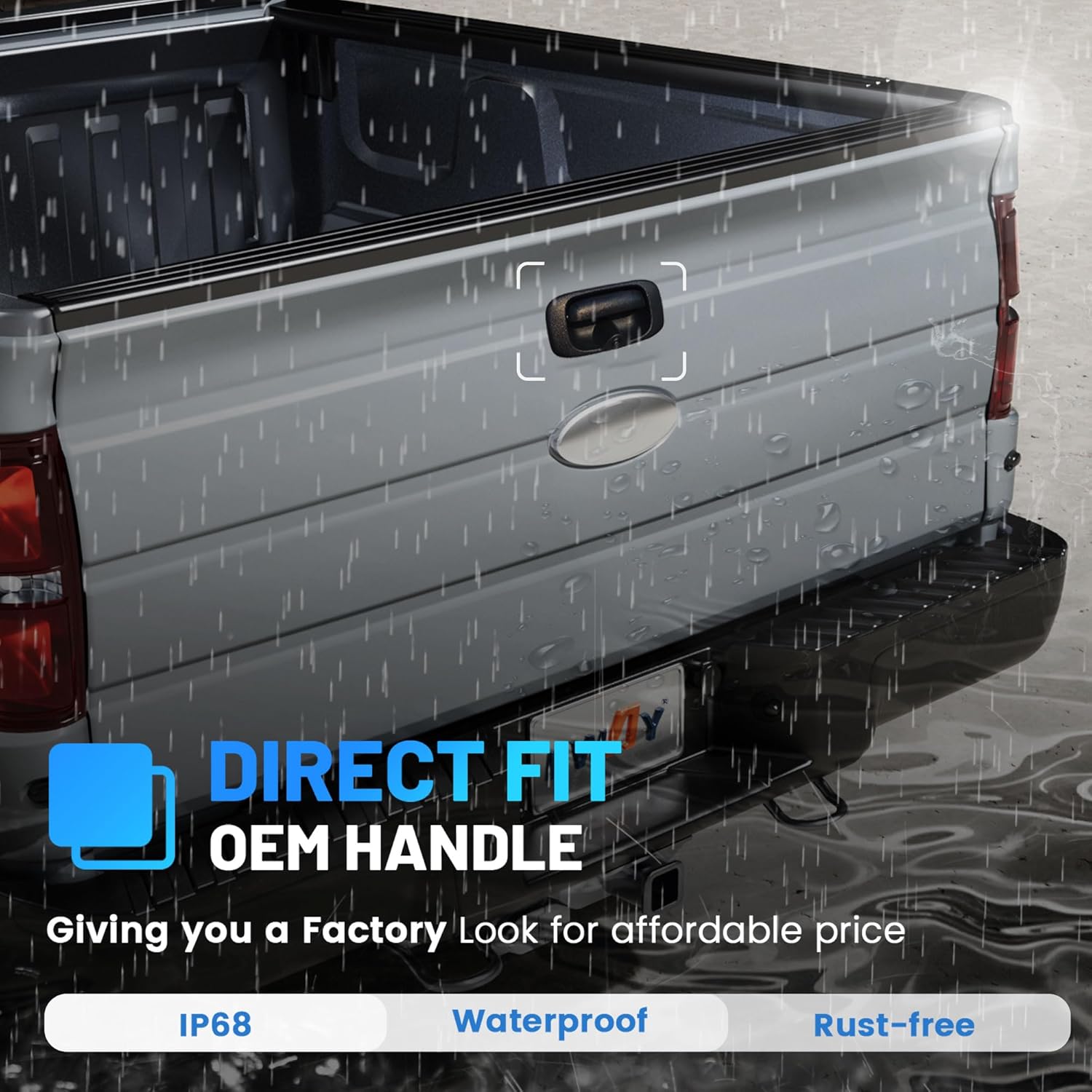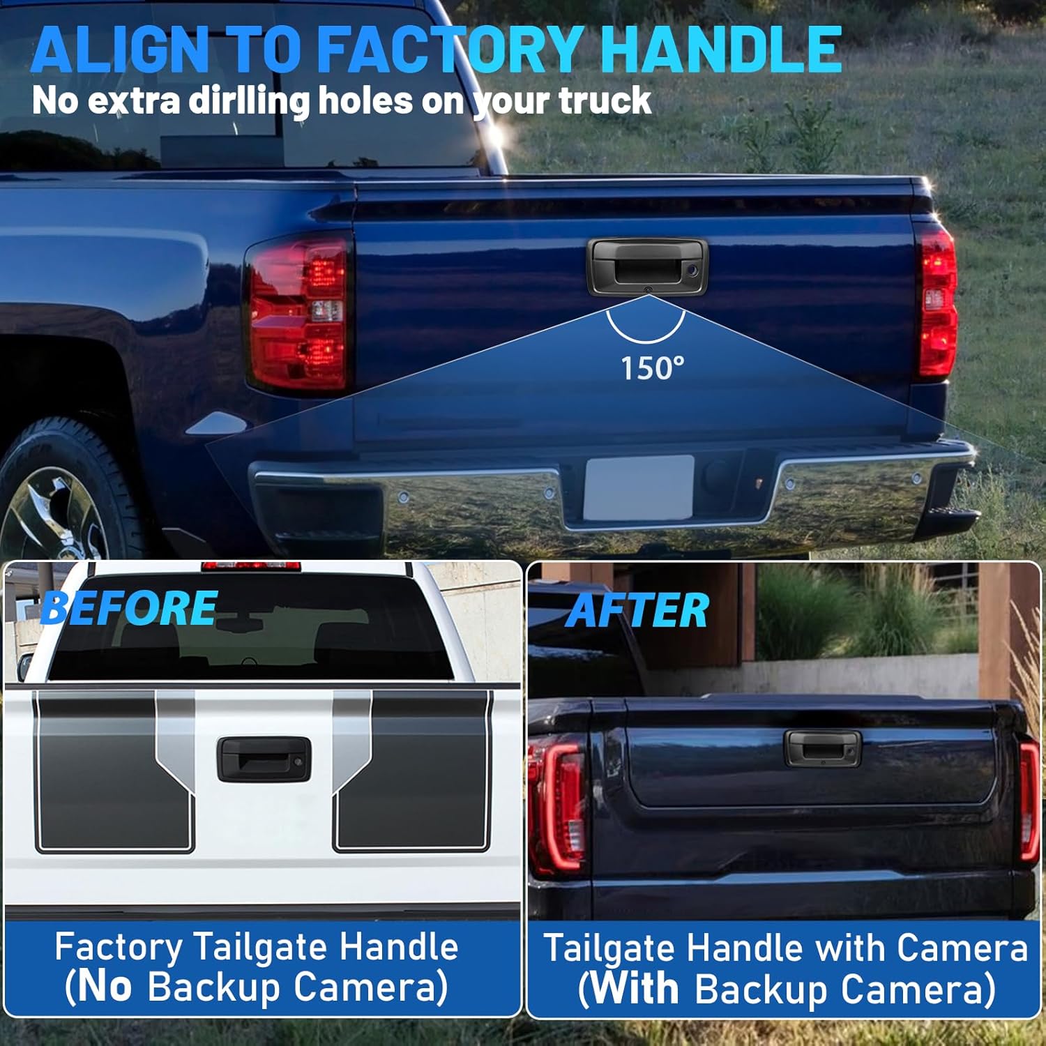 - 【Fits and Feel Like OEM Handle】 Factory black texture backup camera tailgate handle kit, replace OEM tailgate handle latch at your truck rear gate door, add on a clear rear view for reversing. Designed to match the dimensions and specifications of the OEM factory part for our silverado pickup truck tailgate door handle.